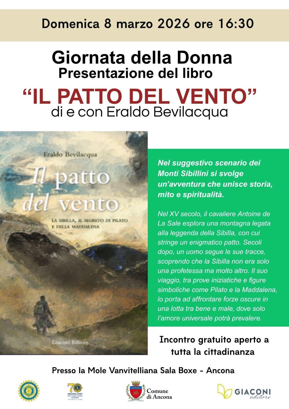 Ore 16.30 Sala Boxe Presentazione del libro "Il Patto del Vento" di Eraldo Bevilacqua con l'accompagnamento a cura dell'Associazione Inner Wheel e Lions