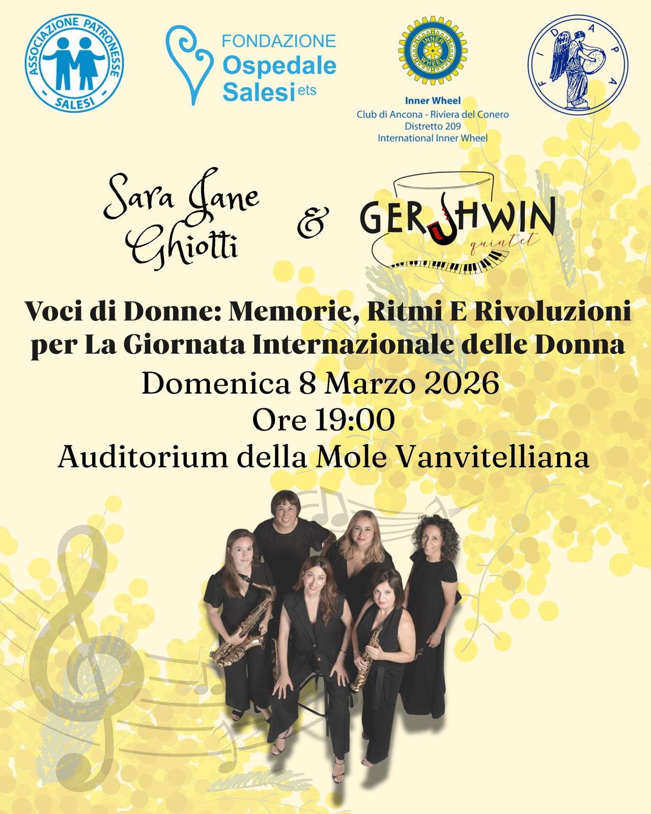 EVENTO CONCLUSIVO – AUDITORIUM – alle ore 19:00 presso Auditorium con lo spettacolo di chiusura: Sara Jane Ghiotti & Gershwin Quintet "Voci di Donne: Memorie, ritmi e rivoluzioni" offerto dalla Fidapa, Inner Wheel Riviera del Conero, Associazione Patronesse Salesi, Fondazione Ospedale Salesi ETS.