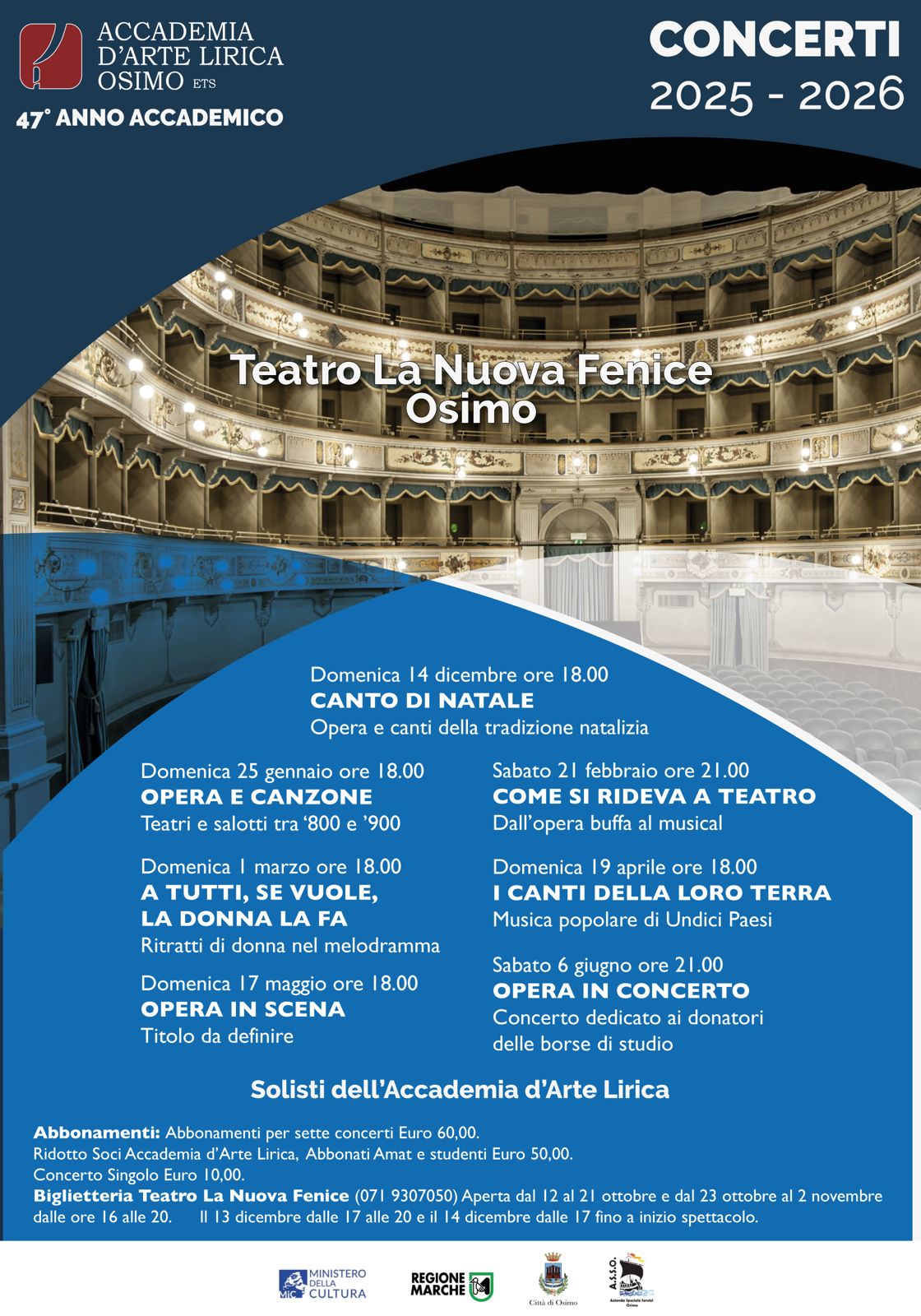 Si aprono gli abbonamenti per la nuova stagione concertistica dell'Accademia d'Arte Lirica di Osimo: un ricco cartellone di concerti da dicembre 2025 a giugno 2026. I sette appuntamenti sul palco del Teatro La Nuova Fenice vedranno protagonisti i solisti dell'Accademia. Sono giovani cantanti provenienti da 11 nazioni, che perfezionano il loro talento presso la storica Istituzione osimana. Si comincia domenica 14 dicembre, alle ore 18.00, con il tradizionale "Canto di Natale": arie d'opera e canti della tradizione natalizia. Domenica 25 gennaio, alle ore 18.00, "Opera e canzone" con le musiche che animavano i teatri e i salotti tra '800 e '900. Sabato 21 febbraio, alle ore 21.00, "Come si rideva a teatro", scatena la comicità dell'opera buffa, i doppi sensi dell'operetta e le ironie graffianti del musical. Domenica 1 marzo, alle ore 18.00, protagoniste femminili "A tutti, se vuole, la donna la fa" è un viaggio musicale nell'universo femminile del melodramma. Domenica 19 aprile si accendono i ritmi del folklore con "I Canti della loro Terra", musica popolare di undici paesi. Domenica 17 maggio, alle ore 18.00, "Opera in scena" offrirà un titolo d'opera, scelto per far debuttare i cantanti del nuovo anno accademico, il quarantasettesimo dalla fondazione. Si conclude sabato 6 giugno alle ore 21.00 con "Opera in concerto", serata dedicata ai donatori delle borse di studio, in cui verranno consegnati gli attestati agli allievi che termineranno il loro percorso accademico. E' possibile sottoscrivere l'abbonamento presso la biglietteria del Teatro La Nuova Fenice (tel. 071 9307050) dal 12 al 21 ottobre e dal 23 ottobre al 2 novembre, dalle 16 alle 20. Il 13 dicembre dalle 17 alle 20 e il 14 dicembre dalle 17 fino a inizio spettacolo. Abbonamenti per sette concerti euro 60, Ridotto Soci Accademia d'Arte Lirica, Abbonati Amat e studenti euro 50. Concerto singolo euro 10.