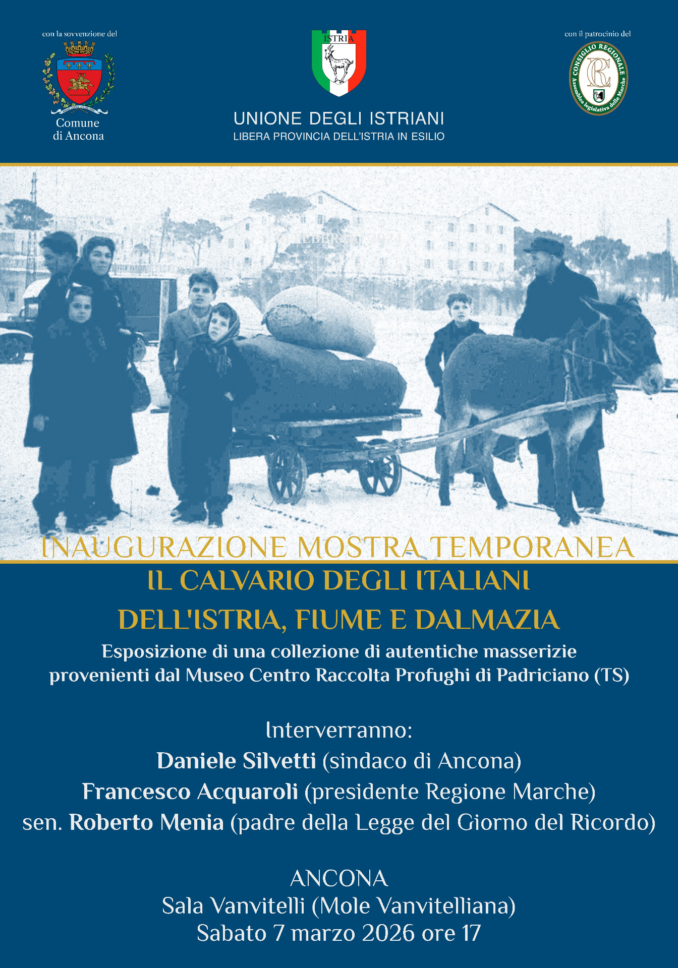 "Questa mostra va a completare la serie di iniziative realizzate in occasione del Giorno del Ricordo del 10 febbraio scorso. Essa rappresenta un grande momento di approfondimento per chiunque voglia conoscere la vicenda degli istriani ed il calvario che hanno dovuto subire. Un periodo storico che va ricordato soprattutto per la violenza che l'ha caratterizzato e che ha colpito la popolazione italiana di quel territorio" afferma il vice sindaco di Ancona, Giovanni Zinni.