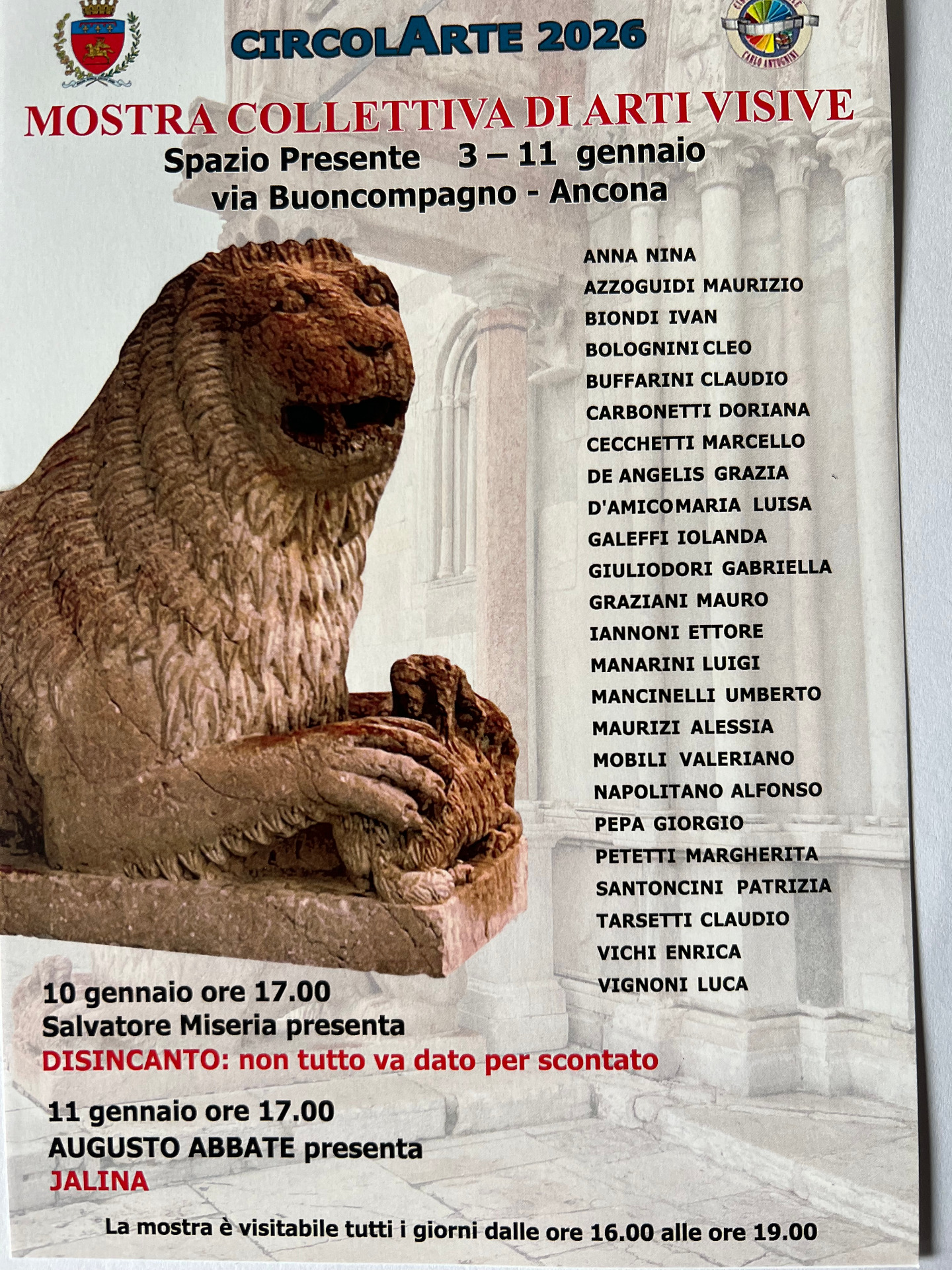 ANCONA - MOSTRA A SPAZIO PRESENTE FINO A DOMENICA 11/1. Espongono 24 artisti associati al Circolo Culturale Antognini - Ospita due eventi culturali nel fine settimana