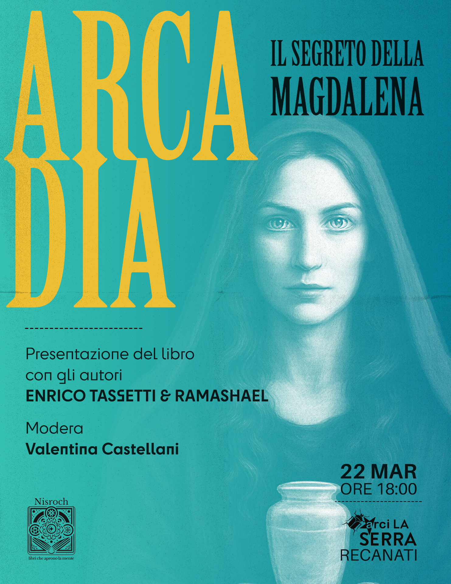 L'associazione Arci La Serra di Recanati (via Beniamino Gigli, via Cavour 53) ospita domenica 22 marzo alle ore 18:00 la presentazione di Arca‑Dia. Il Segreto della Magdalena, il nuovo libro di Enrico Tassetti e Ramashael, pubblicato da Edizioni Nisroch. Un'opera che intreccia ricerca storica, simbolismo e narrazione contemporanea, invitando il lettore a esplorare una figura – quella della Magdalena – spesso fraintesa, ma centrale in molte tradizioni spirituali. L'incontro sarà moderato da Valentina Castellani, che guiderà il dialogo con gli autori attraverso i temi chiave del volume: il rapporto tra storia e mito, la trasmissione dei saperi femminili, e il ruolo della conoscenza interiore come strumento di trasformazione.