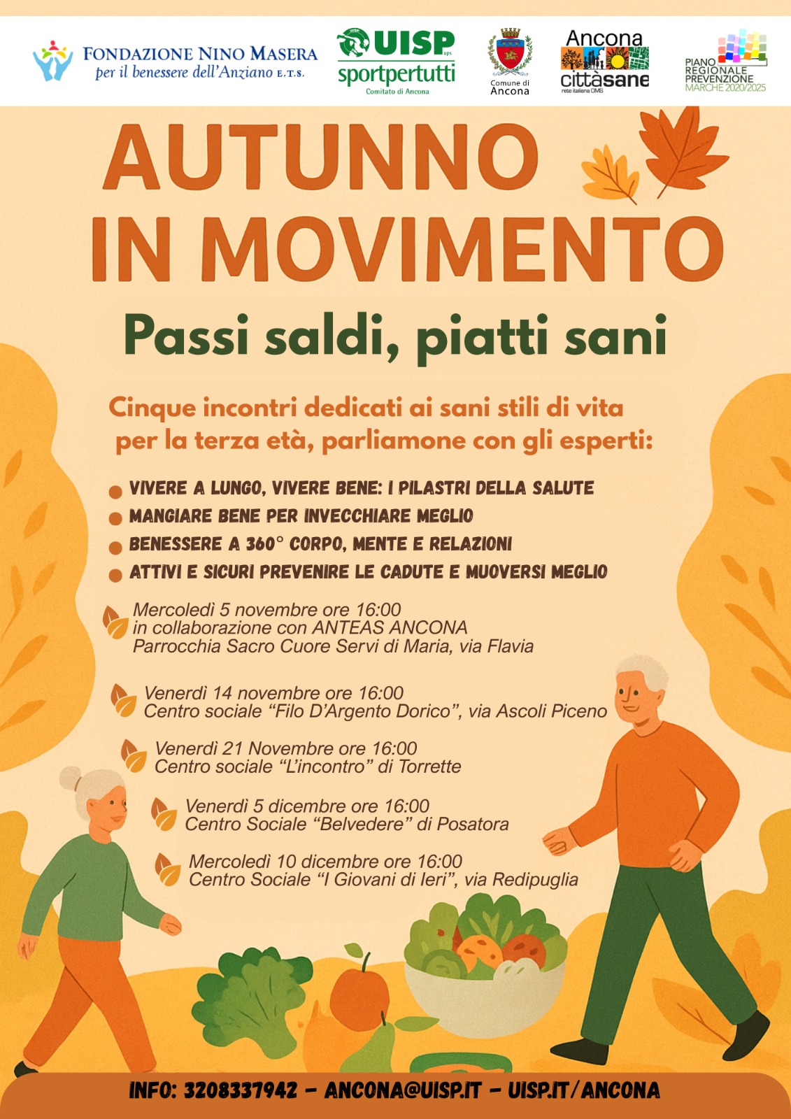 L'iniziativa, sostenuta dalla Fondazione Nino Masera per il benessere dell'anziano ETS e realizzata assieme a UISP Ancona nell'ambito del programma Ancona Città Sane, propone cinque appuntamenti aperti alla cittadinanza nei centri sociali e in altri luoghi aggregativi della città, con esperti che affronteranno temi legati all'alimentazione equilibrata, al movimento e alla qualità della vita nella terza età.