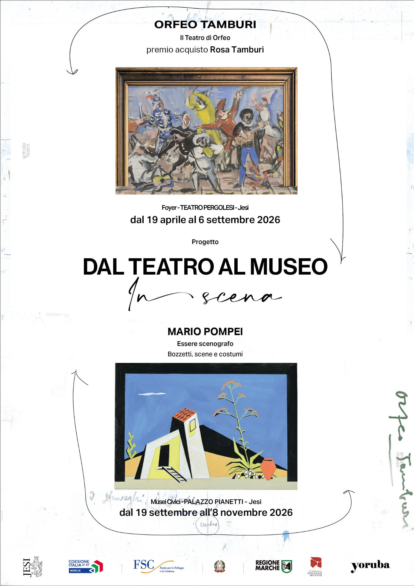 Dal 19 settembre all'8 novembre 2026, il progetto proseguirà ai Musei Civici di Palazzo Pianetti di Jesi, che ospiteranno la mostra Mario Pompei. Essere Scenografo. Bozzetti, scene e costumi,a cura degli storici Pierfrancesco Giannangeli e Maria Letizia Paiato, esposizione proveniente dal Museo di Palazzo Ricci di Macerata (dove sarà visitabile dal 18 aprile al 2 giugno 2026 in collaborazione con Fondazione Carima). A Jesi si aggiungeranno ai bozzetti di scenografie, incentrati soprattutto sull'opera lirica, altri di prosa e varietà sempre provenienti dall'Archivio Pompei curato da Paola Pallottino, storica dell'illustrazione che da anni studia e valorizza la produzione dell'artista. L'allestimento della mostra sarà curato dallo scenografo Benito Leonori. Sarà inoltre riservato uno spazio speciale al personaggio di Pinco Pallino, corredando la mostra di attività didattiche rivolte alle scuole e alle famiglie. I due momenti pensati e studiati nell'arco di circa un anno saranno animati e resi accessibili al grande pubblico grazie a originali proposte didattiche e laboratoriali appositamente ideate da Petra Leonori. Le due mostre, quella di Orfeo Tamburi e di Mario Pompei, allestite nelle due importanti istituzioni culturali cittadine, in collaborazione con la Scuola di Scenografia dell'Accademia di Belle Arti di Macerata, animeranno un lungo periodo trasportandoci con leggerezza e vitalità, dal teatro al museo o dal museo al teatro come solo questi magici luoghi possono fare.
