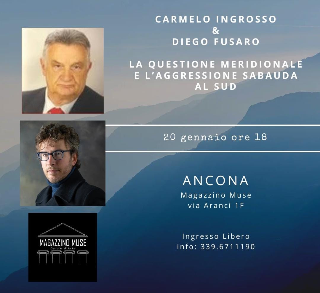 Il Sud al centro nel libro «Savoia Fascisti Repubblichini». Lo scrittore Carmelo Ingrosso e il filosofo Diego Fusaro a Magazzino Muse di Ancona. L'evento, dal titolo ´La questione meridionale e l'aggressione sabauda al Sud´, è previsto per martedì (20 gennaio), alle ore 18, in Via degli Aranci 1/F. Un libro che propone una visione critica del Risorgimento e che affronta temi attuali.
