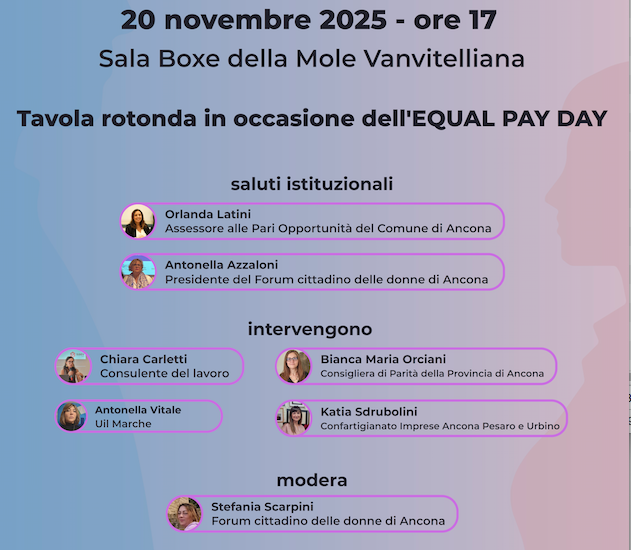 All'incontro sarà inoltre presente la prof.ssa Bianca Maria Orciani, Consigliera di Parità per la Provincia di Ancona. L'evento, in fase di accreditamento per le/gli iscritti all'Albo dei consulenti del Lavoro della Provincia di Ancona, è aperto a tutta la cittadinanza e si inserisce tra le iniziative messe in campo dal Comune di Ancona per il mese di novembre 2025.