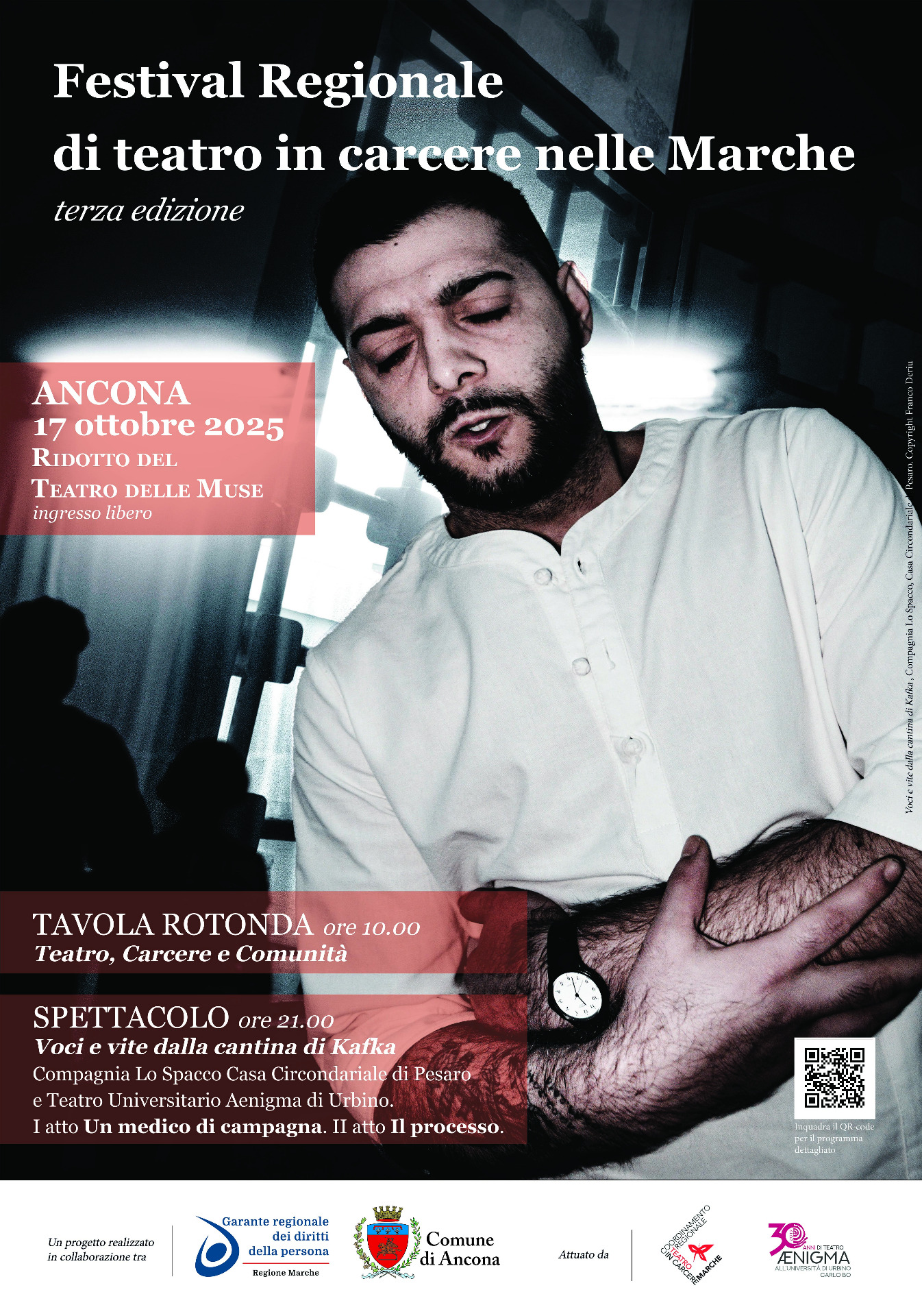 Venerdì 17 ottobre, alle ore 10:00, presso la Sala Ridotto del Teatro delle Muse ad Ancona i cittadini saranno chiamati a partecipare alla tavola rotonda su "Teatro, carcere e Comunità", quale occasione di riflessione condivisa sull'essere uomo dentro e fuori il carcere; alle ore 21:00 in programma la rappresentazione teatrale "Voci e vite dalla cantina di Kafka". Si tratta della fase conclusiva della terza edizione del "Festival regionale di teatro in carcere nelle Marche" realizzato dal Garante regionale dei diritti della persona delle Marche, Giancarlo Giulianelli, in collaborazione con il Comune di Ancona ed attuato concretamente dall'Associazione culturale cittadina universitaria "Aenigma APS", capofila del coordinamento regionale Teatro in Carcere Marche.