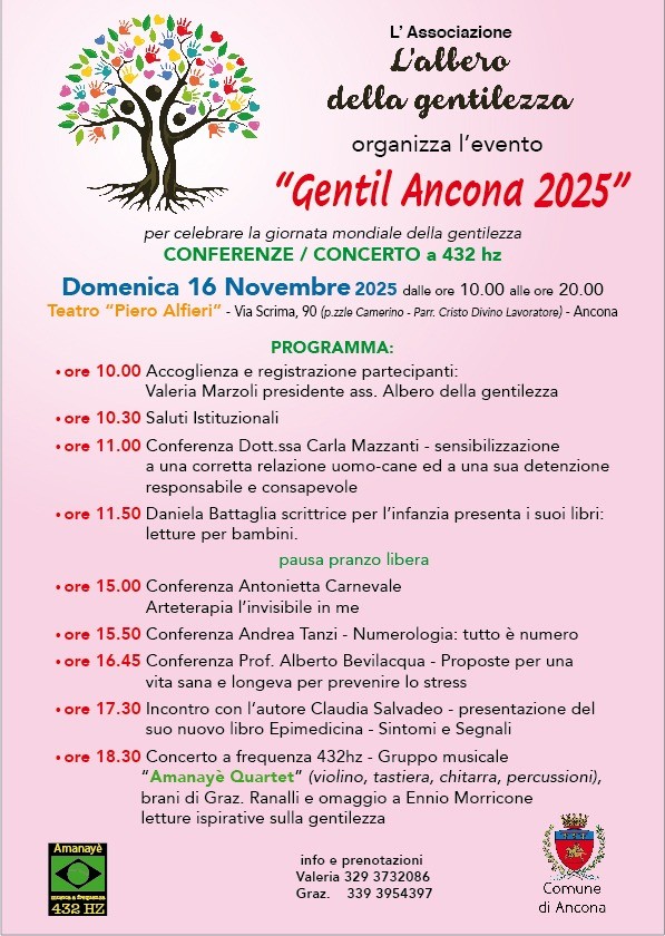 GIORNATA MONDIALE DELLA GENTILEZZA: CON L'ASSOCIAZIONE “L'ALBERO DELLA GENTILEZZA” L'EVENTO “GENTIL ANCONA 2025” CON CONFERENZE E UN CONCERTO A 432 HZ DOMENICA PROSSIMA 16 NOVEMBRE