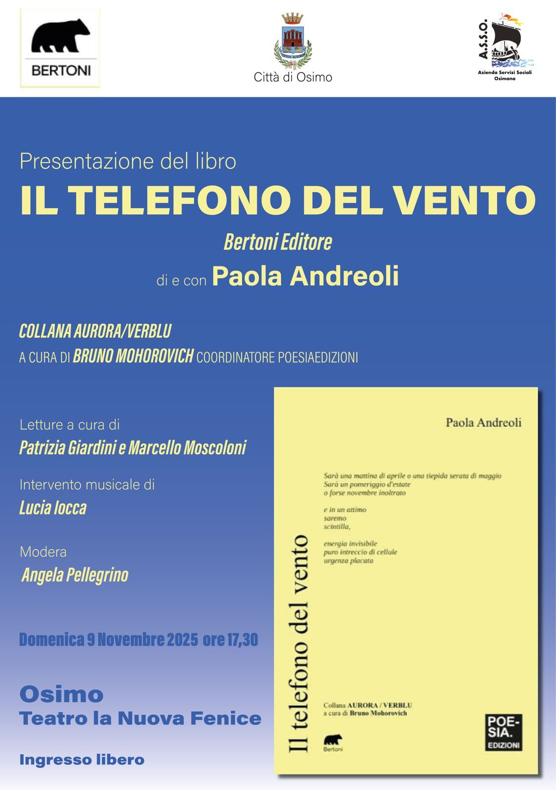 Paola Andreoli, l'astro brillante della poesia osimana contemporanea, continua la sua ascesa luminosa con una serata dedicata alla poesia al teatro La Nuova Fenice. In seguito ai numerosi riconoscimenti ottenuti dalla poetessa ed apprezzando profondamente il suo inconfondibile stile poetico e il suo talento, l'Editore Bertoni ha voluto pubblicare "Il telefono del vento", un'antologia di poesie che sarà presentata domenica 9 novembre 2025 nella splendida cornice del teatro di Osimo. "In un dialogo sospeso tra memoria e vento, Paola Andreoli ci conduce all'interno di una cabina telefonica speciale: un luogo reale e simbolico dove chi resta può ancora "parlare" con chi non c'è più",scrive Bertoni Editore. "Ispirata al Kaze no Denwa giapponese, questa raccolta poetica è un viaggio nei territori della perdita, della nostalgia e della rinascita, in cui i ricordi si fanno vento e le parole diventano ponte tra mondi separati".Non leggiamo e scriviamo poesie perché ci gratifica. Leggiamo e scriviamo poesie perché apparteniamo al genere umano che si caratterizza per l'empatia coi propri simili e per le emozioni che prova. La poesia, la bellezza e l'amore sono quindi quegli elementi essenziali del nostro sentire, purtroppo marginalizzati nella nostra società cinica e frenetica, che hanno il merito di tenerci ancora in vita.Poetessa per passione o forse solo per caso, come ama definirsi, Paola Andreoli ha iniziato ad ottenere riconoscimenti nel mondo letterario ormai una decina di anni fa e da allora non si è più fermata. La pubblicazione di quest'ultima antologia è l'ennesima tappa di un percorso virtuoso che non accenna a fermarsi e che riserverà sicuramente altre grandi soddisfazioni all'autrice e a tutta la città di Osimo. L'appuntamento è quindi domenica 9 novembre 2025 alle ore 17.30 presso il teatro la Nuova Fenice di Osimo per emozionarsi all'ascolto de "Il telefono del vento" in una serata, moderata da Angela Pellegrino e con il commento musicale di Lucia Iocca, che si prospetta davvero intensa e unica.