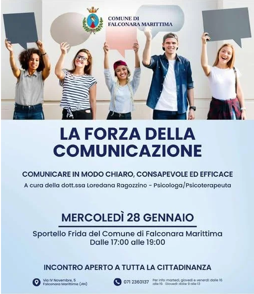 ‘LA FORZA DELLA COMUNICAZIONE’, IL 28 GENNAIO ALLE 17 SEMINARIO DELLO SPORTELLO FRIDA DI FALCONARA CON LA PSICOLOGA RAGOZZINO