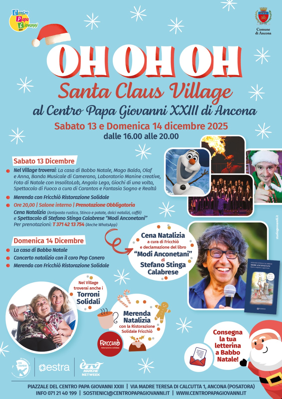 Con il patrocinio del Comune di Ancona al Terzo Settore, torna "OH OH OH Santa Claus Village" al Centro Papa Giovanni XXIII di Ancona che per la prima volta si svolgerà in due giornate, sabato 13 e domenica 14 dicembre, dalle 16.00 alle 20.00, un'interessante iniziativa natalizia per bambini e famiglie. L'evento offrirà intrattenimento e gioia a grandi e piccini per far vivere un pomeriggio magnifico. Dai laboratori creativi, alla musica con i canti natalizi, spettacoli di magia alla merenda proposta dalla ristorazione solidale del centro, tante saranno le attività anche al chiuso con i volontari della struttura, con la straordinaria partecipazione nella serata di sabato 13 di STINGA con "Modi Anconetani". Si ripete l'appuntamento natalizio gratuito che ha riscontrato negli anni passati grande successo, naturalmente con la presenza dell'immancabile Babbo Natale. "Questa iniziativa -afferma l'assessora al Terzo Settore e alla Famiglia, Orlanda Latini- rivolta a tutta la famiglia oltre ad essere un momento di festa per grandi e piccoli è anche occasione per condividere e conoscere una delle realtà dell'associazionismo molto attiva nel territorio dorico, e per promuovere l'inclusione sociale e costruire insieme una comunità sempre più coesa"