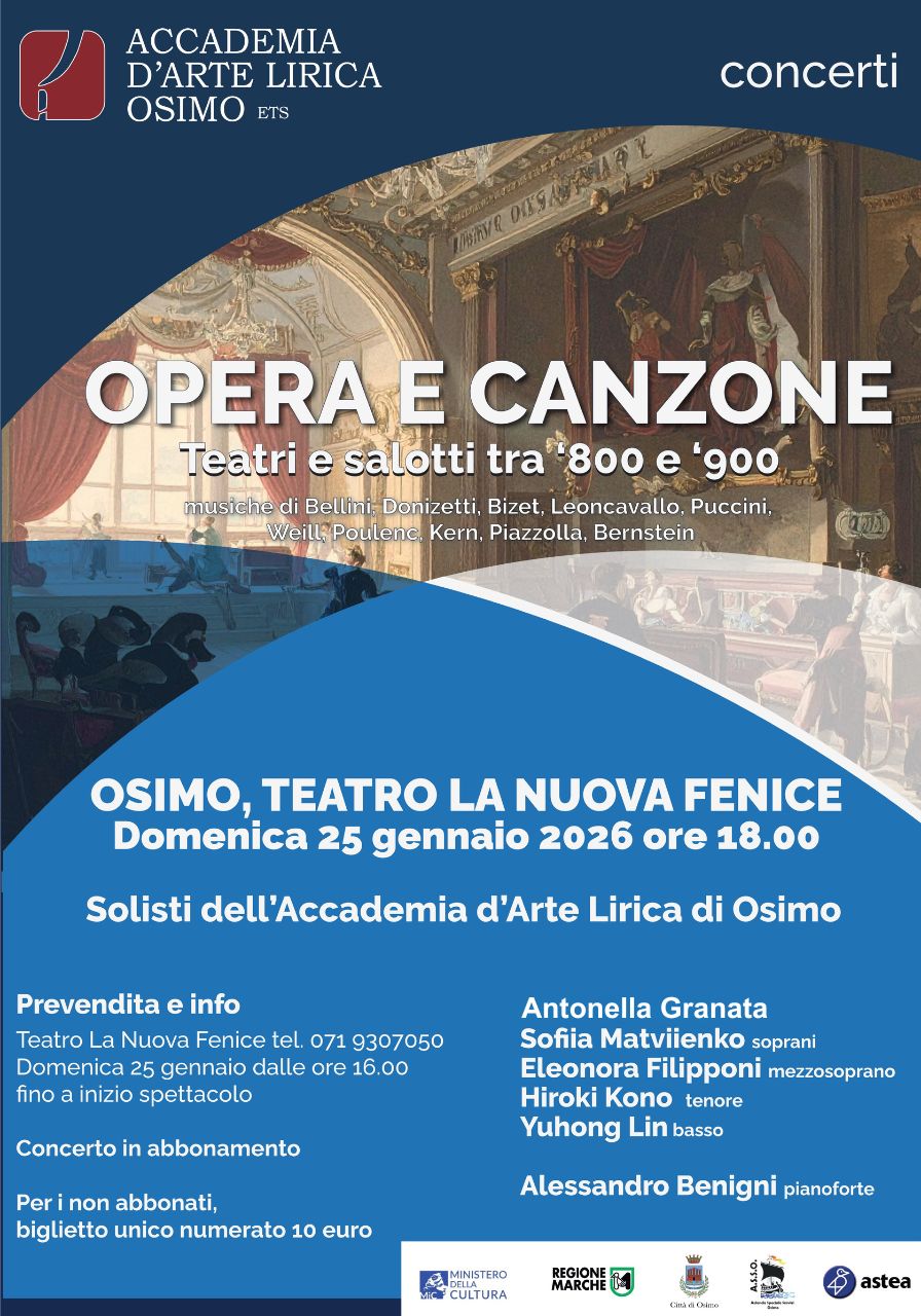 Domenica 25 gennaio alle ore 18.00, al Teatro La Nuova Fenice di Osimo, il primo concerto del 2026 per l'Accademia d'Arte Lirica di Osimo propone "Opera e Canzone – Teatri e salotti tra '800 e '900". Sono protagonisti i giovani solisti e il pianista Alessandro Benigni. I teatri e i salotti rappresentavano i luoghi centrali della vita sociale di ogni città: in entrambi luoghi si cantava musica lirica, operetta e canzone. Il concerto prevede arie, duetti e pezzi d'assieme di Bellini, Donizetti, Puccini, Leoncavallo, un tango di Piazzolla, brani da musical di Kern e Bernstein canzoni di Weill e Poulenc. Le giovani voci sono quelle di Antonella Granata e Sofiia Matviienko, soprani, Eleonora Filipponi, mezzosoprano, Hiroki Kono, tenore, e Yuhong Lin, basso.Prevendita presso il Teatro La Nuova Fenice (tel. 0719307050) domenica 25 gennaio dalle 16.00 fino a inizio spettacolo. Concerto in abbonamento. Per i non abbonati biglietto unico numerato 10 euro.