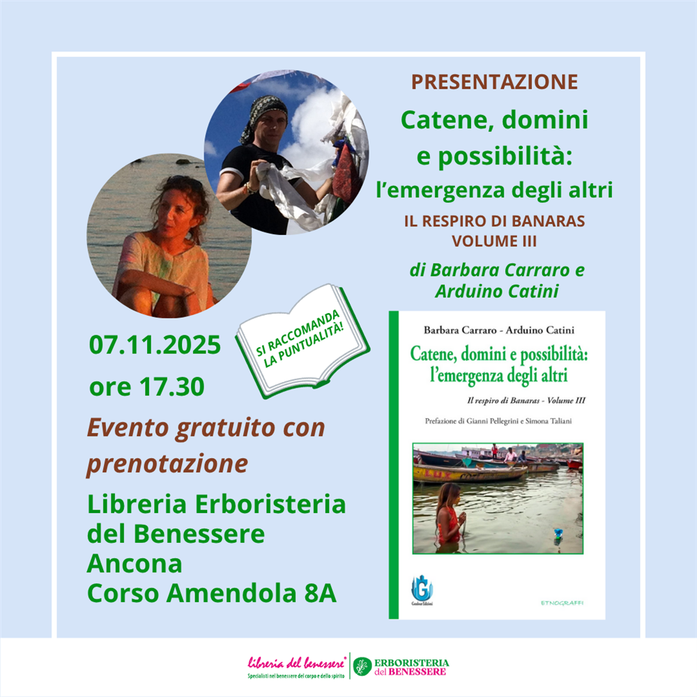 Pronti a un viaggio inconsueto fra India e Occidente, prima, durante e dopo la pandemia? L'appuntamento è il 7/11alle ore: 17:30 alla Libreria Erboristeria del Benessere, Corso Amendola 8 A, Ancona. Si raccomanda la puntualità, per la presentazione del libro "Catene, domini e possibilità: l'emergenza degli altri". E' un volume del trittico "Il Respiro di Banaras", appassionante ricerca di campo di Barbara Carraro e Arduino Catini che ci condurranno attraverso i sentieri dell'India più profonda, tra narrazione poetica, etnografia, insegnamenti tradizionali e riflessione antropologica. Un percorso che tocca il sacro e il quotidiano, il caos e la quiete, lo studio e la trasformazione. Un viaggio e un libro in cui si susseguono storie di vita, la vicenda di due ricercatori, questioni di genere, la città con i suoi luoghi sacri e mondani, gli spazi fisici del restare o dell'andare, poi d'improvviso Shiva e l'imprevedibile entrano in campo… e il campo non è più soltanto ricerca, si ribalta e si fa altro e oltre. Incontra la donna in catene, la lavandaia eletta libera officiante del rito e un'umanità che arranca o si arrangia, commercia, accoglie o imprigiona, trasmette o ricerca le vie del corpo, del sacro, del Sé, della saggezza, della liberazione: tra meraviglia e turbamento emergeranno inconsueti spazi di affermazione e libertà. Ti abbiamo incuriosito? Incontra gli autori del libro "Catene, domini e possibilità" alla Libreria del Benessere! Data: Venerdì 7 Novembre 2025