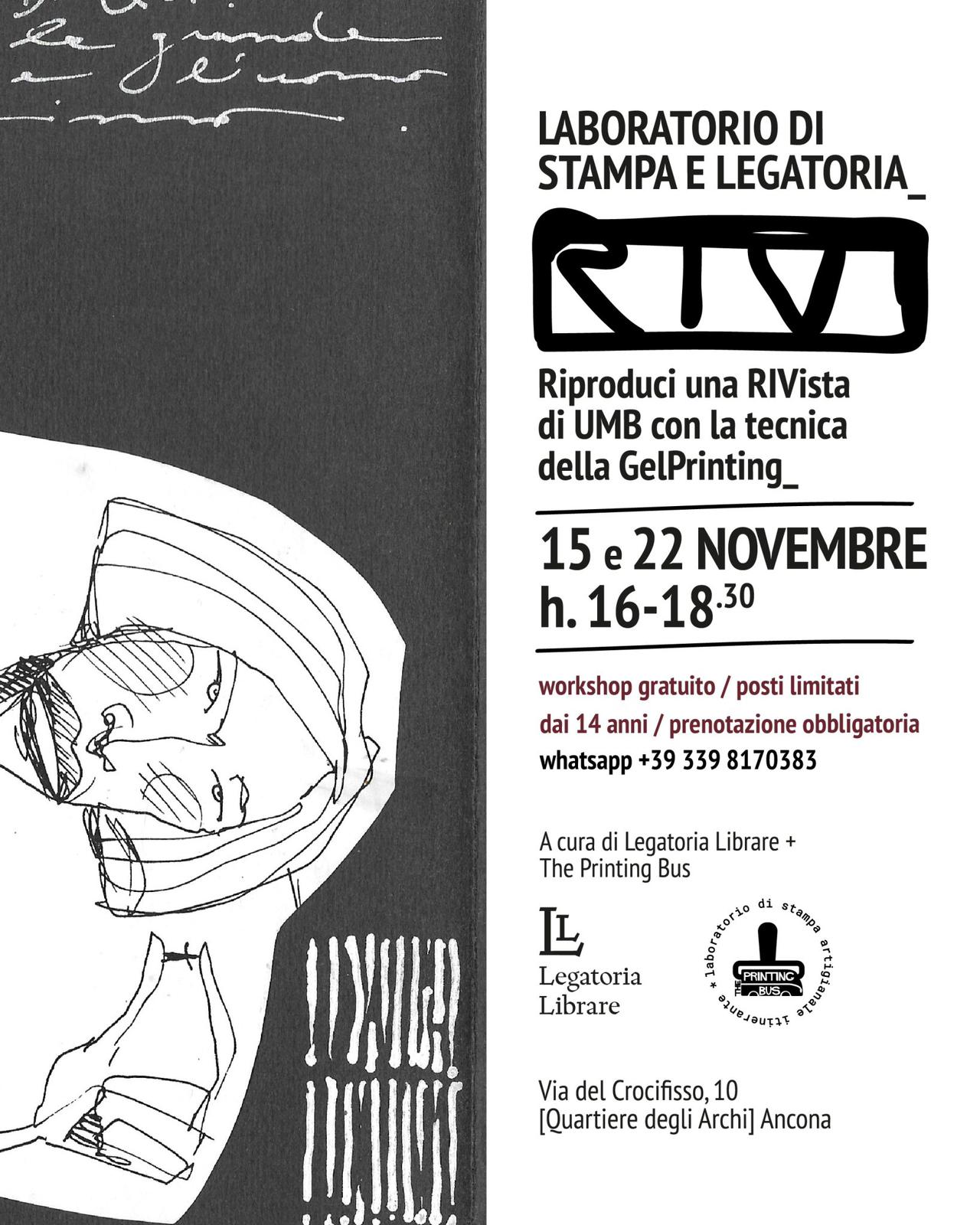 Sempre sabato 15 novembre, dalle ore 16 alle 18.30, alla Legatoria Librare nel Quartiere degli Archi - uno degli spazi dove si sviluppa la mostra - prende il via un laboratorio di stampa e legatoria legato all'immaginario di Umberto Grati in collaborazione con The Printing Bus. "RIV. Riproduci una RIVista di UMB con la tecnica della GelPrinting" è il tema del laboratorio che prosegue anche il 22 novembre. L'attività è aperta a persone da 14 anni in su, ed è totalmente gratuita grazie al supporto della Regione e del Comune, ma i posti sono limitati, è obbligatoria la prenotazione alla mail gratimostra@gmail.com o direttamente al numero whatsapp 339 8170383.
