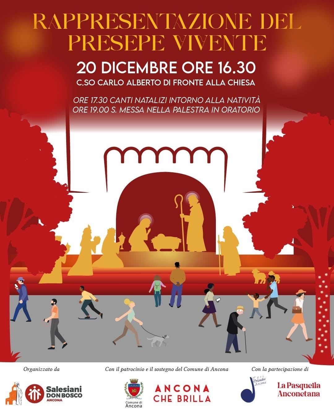 All'interno del programma natalizio 'Ancona che brilla', lungo Corso Carlo Alberto, di fronte alla chiesa, sabato 20 dicembre a partire dalle 16:30 andrà in scena, a cura della Parrocchia Sacra Famiglia il Presepe vivente. L'iniziativa, patrocinata dal Comune di Ancona, è organizzata dai Salesiani di Ancona, con il supporto dei Pasquellanti Anconetani, che porteranno canti e melodie della tradizione marchigiana. A loro si uniranno il coro Orlandini e quello della comunità peruviana, offrendo un repertorio musicale che spazia tra culture e generazioni. Il Presepe Vivente viene rappresentato grazie alla collaborazione di circa cento figuranti: famiglie e giovani che frequentano l'oratorio ne saranno i protagonisti con il sostegno di tanti volontari che contribuiranno alla realizzazione dell'evento. I visitatori potranno immergersi nell'autentica atmosfera del presepe grazie alle numerose botteghe artigianali allestite lungo il percorso. Ogni bottega offrirà una finestra sul passato, tra mestieri antichi e prodotti tipici, creando un ambiente vivo e coinvolgente che farà rivivere la magia della Natività. "L'iniziativa proposta dall'oratorio dei Salesiani e patrocinata dal Comune – spiega l'Assessore alle Politiche giovanili e Volontariato civico Marco Battino - è giunta al terzo anno e consente di coinvolgere molti giovani di tante nazionalità differenti e contribuisce non solo a rivitalizzare il quartiere, ma anche e soprattutto a rendere unita e coesa la comunità". Alle 19.00 si terrà la Santa Messa. A seguire è previsto l'arrivo dei Magi.