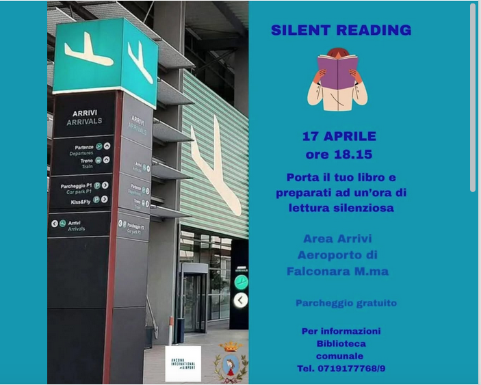 SILENT READING PARTY: VENERDI’ ALLE 18.15 LA LETTURA SI FA ESPERIENZA CONDIVISA ALL’AEROPORTO DI FALCONARA - Al Terminal Arrivi il secondo incontro con la Biblioteca comunale, dopo l’appuntamento dell’anno scorso al giardino pensile