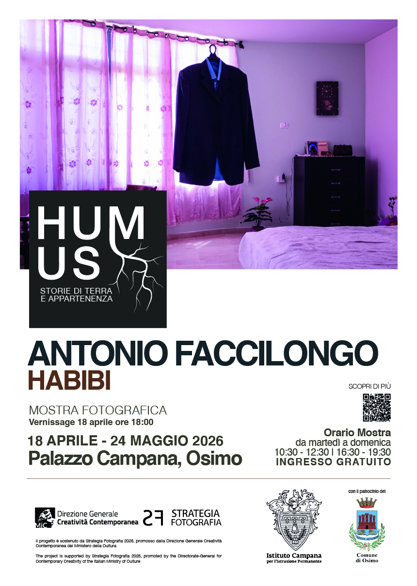 Sabato 18 aprile alle ore 18.00 a Palazzo Campana di Osimo sarà inaugurata la mostra "HABIBI" di Antonio Faccilongo, secondo appuntamento del progetto "Humus. Storie di terra e appartenenza". Sarà presenti il direttore artistico Stefano Schirato e l'autore Antonio Faccilongo. La mostra, a ingresso gratuito, sarà visitabile fino al 24 maggio 2026 ed è parte di un più ampio programma vincitore dell'avviso pubblico Strategia Fotografia 2025, promosso dalla Direzione Generale Creatività Contemporanea del Ministero della Cultura e organizzato dall'Istituto Campana per l'Istruzione Permanente di Osimo. Il progetto nasce con l'obiettivo di valorizzare il lavoro documentario di fotoreporter di fama internazionale che indagano temi di forte attualità, esplorando il rapporto tra individui, luoghi e territori, intesi sia in senso fisico che culturale.