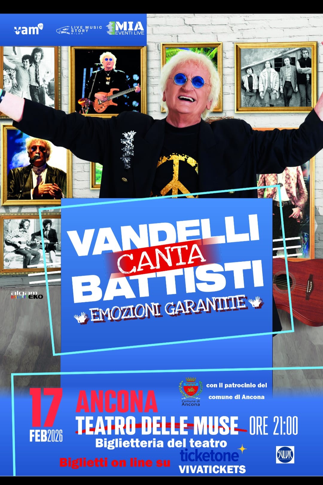 "Vandelli canta Battisti" si preannuncia come uno spettacolo da "Emozioni Garantite" come recita il sottotitolo dell'evento al Teatro delle Muse, ore 21.00, di martedì 17 febbraio 2026. Il rapporto di Maurizio Vandelli con Ancona viene da lontano: qui ha festeggiato i suoi 80 anni lo scorso anno e qui ha tenuto il concerto "Battiti di musica" che ha registrato il tutto esaurito alle Muse due anni or sono con un ampio consenso di pubblico. Le musiche indimenticabili di Battisti e le parole coinvolgenti di Mogol, che lo stesso Vandelli ha contribuito ad interpretare più volte e portare al successo ai tempi dell'Equipe 84, sono un pezzo di storia, fra mito e leggenda, nel panorama della musica italiana. Al Teatro delle Muse, in una serata organizzata dalla associazione culturale SULVIC con il patrocinio del Comune di Ancona, che si appresta a registrare un altro sold out già nelle prevendite dei biglietti, le canzoni senza tempo del Lucio nazionale, re dei cantautori e ancora oggi amatissimo dal pubblico e riscoperto anche dai giovani, avranno nuova vita con un Vandelli in grande spolvero che proprio adesso con questo spettacolo sta girando mezza Italia, suscitando grandi emozioni e portando anche alle nuove generazioni il valore artistico e culturale di tutta la produzione Mogol-Battisti.